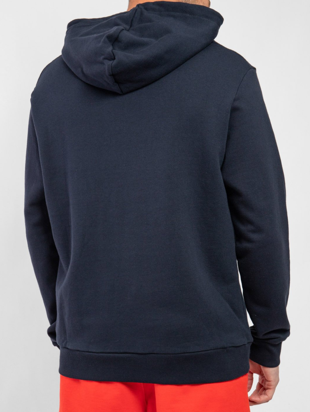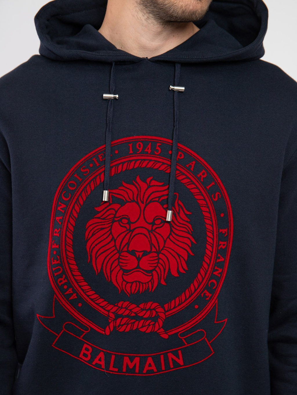 Balmain Paris Flocked Logo - pánska mikina Materiál: 100% bavlna Farba: tmavomodrá, červená Typ: s kapucňou Strih: regular fit Vzor: so vzorom Zapínanie: bez zapínania Detail: logo značky Model: XH2JT046BB56 Made in Portugal