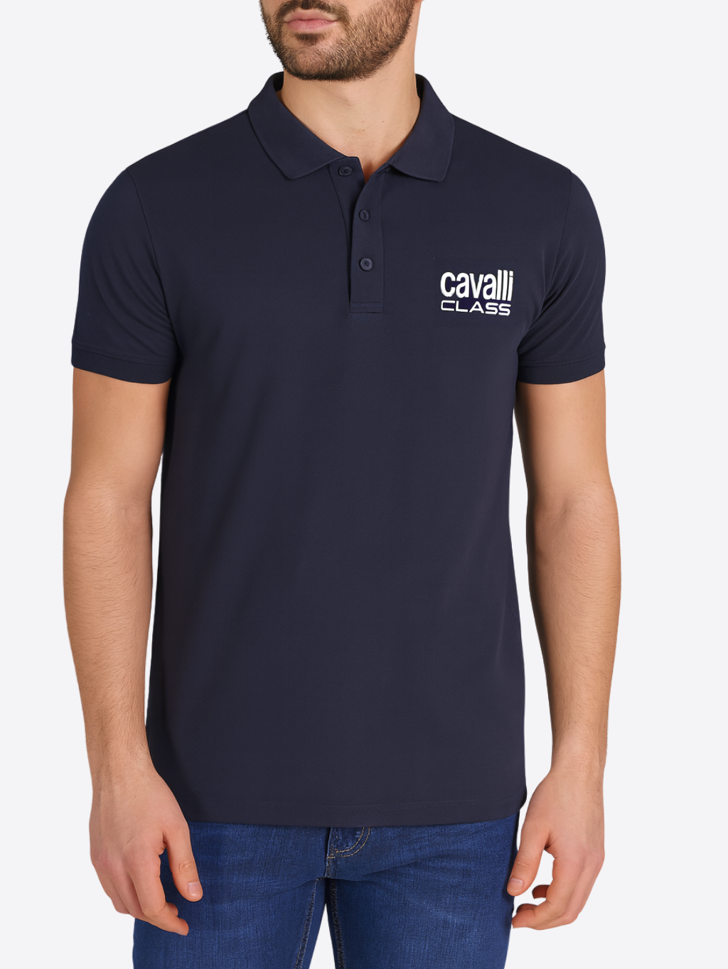 Cavalli Class Carlo - pánske polo tričko Materiál: 100% bavlna Farba: tmavomodrá, biela Strih: regular fit Vzor: jednofarebný, so vzorom Detail: logo značky Model: QXT64Z