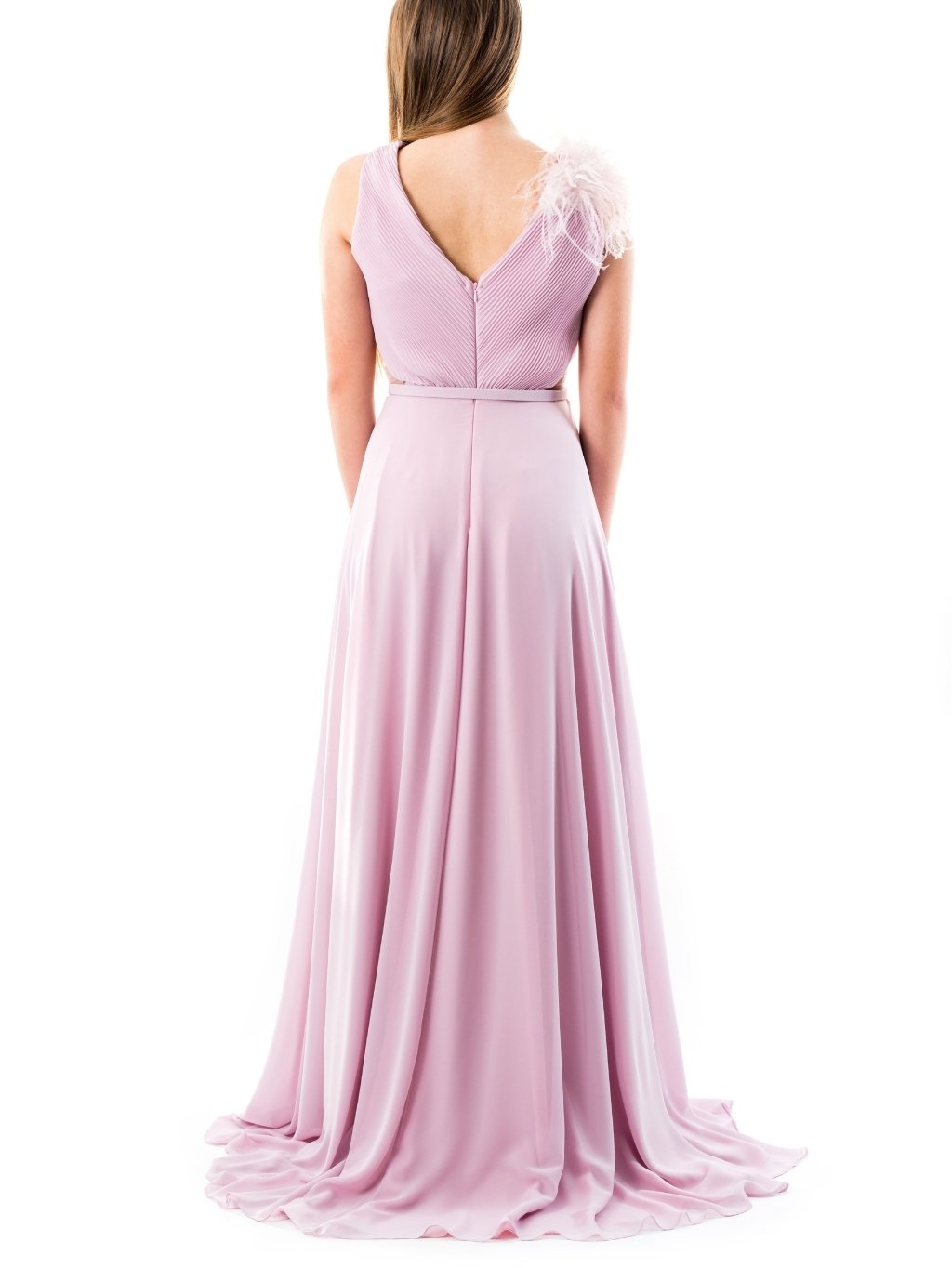 For Costume - dámske spoločenské šaty Materiál: 100% polyester Farba: ružová Strih: puzdrový Vzor: jednofarebné Typ výstrihu: výstrih do V Rukávy: bez rukávov Zapínanie: na zips Dĺžka: dlhé Detail: doplnok páperia Model: 6381 Made in Turkey