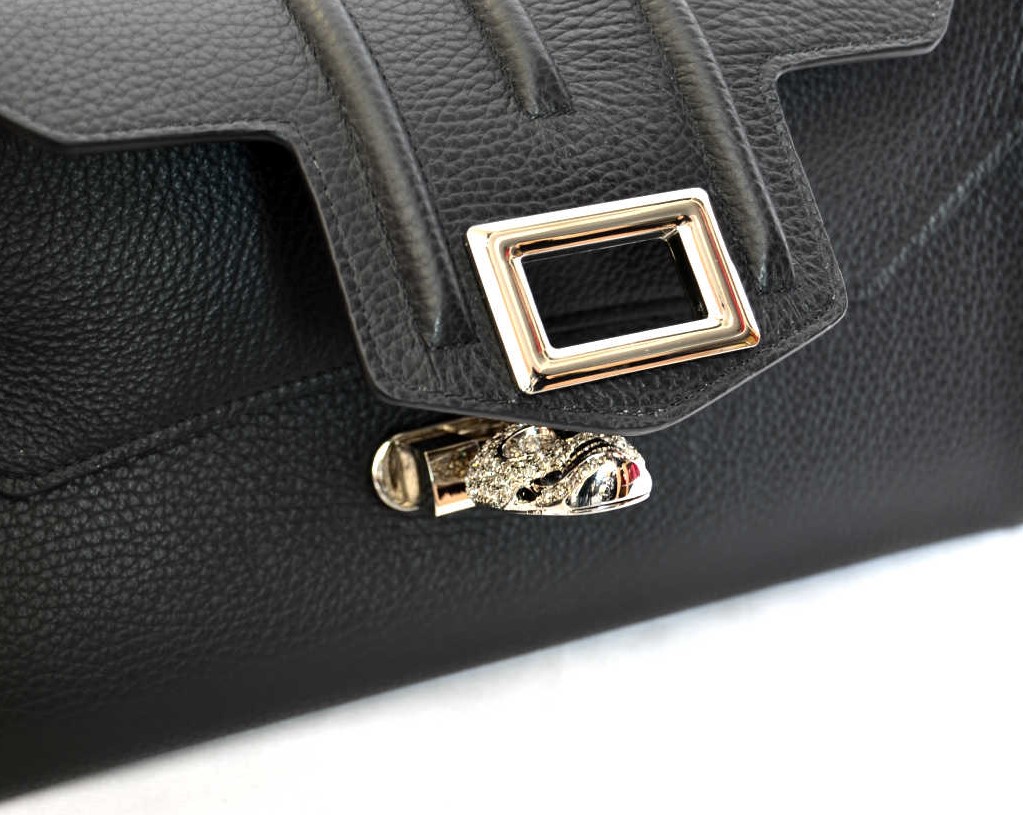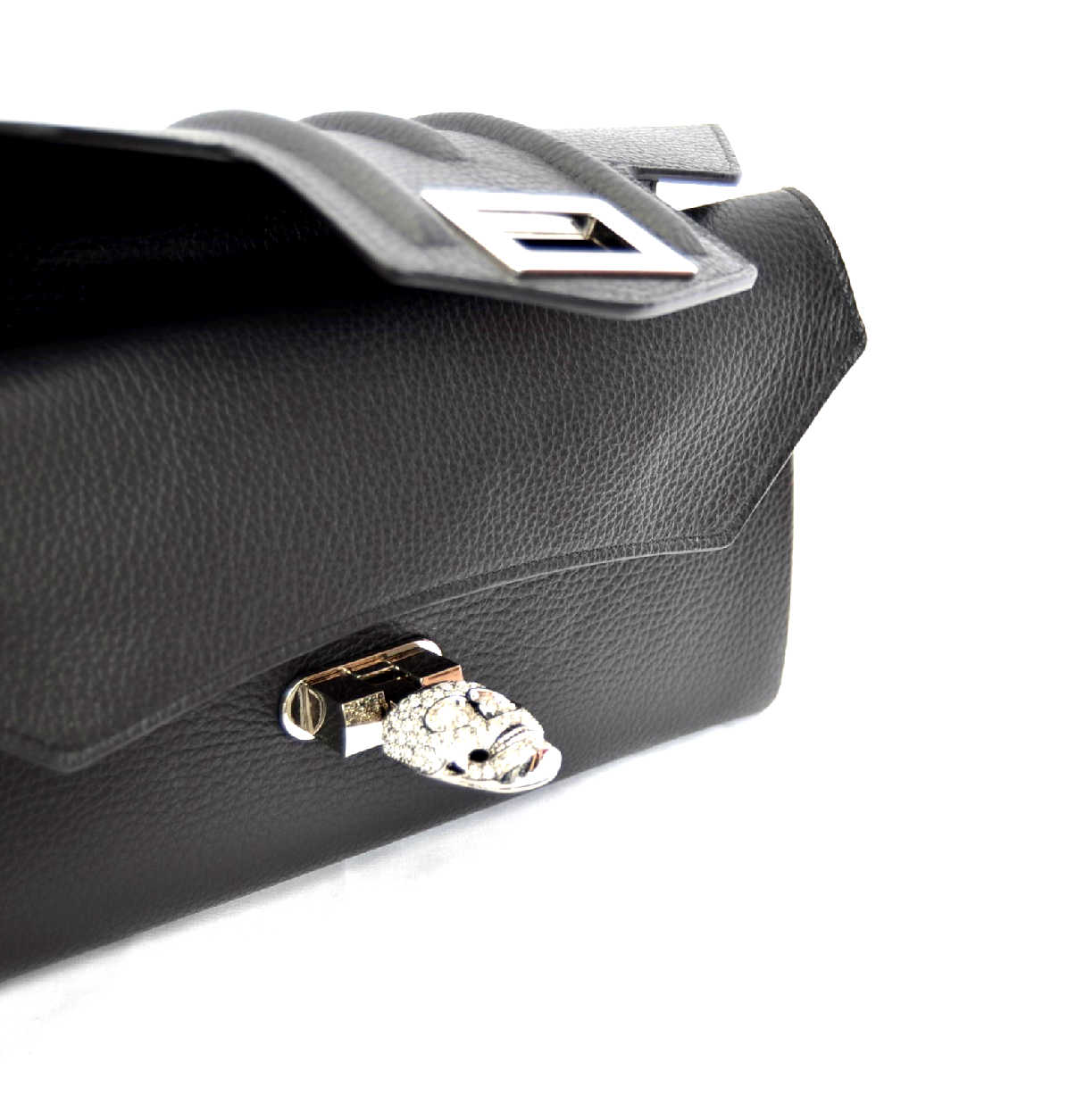 PHILLIP PLEIN HIGHWAY – listová kabelka Materiál: koža Farba: čierna Rozmery: výška: 14 cm • šírka: 4 cm • dĺžka: 29 cm Zapínanie: mechanické Ramienko na plece: nie Počet komôr: 2 Ochranné nožičky: nie Detail: kovové doplnky striebornej farby, swarovski kryštály Model: AW931464 Made in Italy Nádherne čierna. Priestranná. Z kvalitných materiálov. Skrášli nudné ulice počas všedného dňa. Odteraz ste neodolateľná aj vďaka dámskej kabelke Philipp Plein Highway.