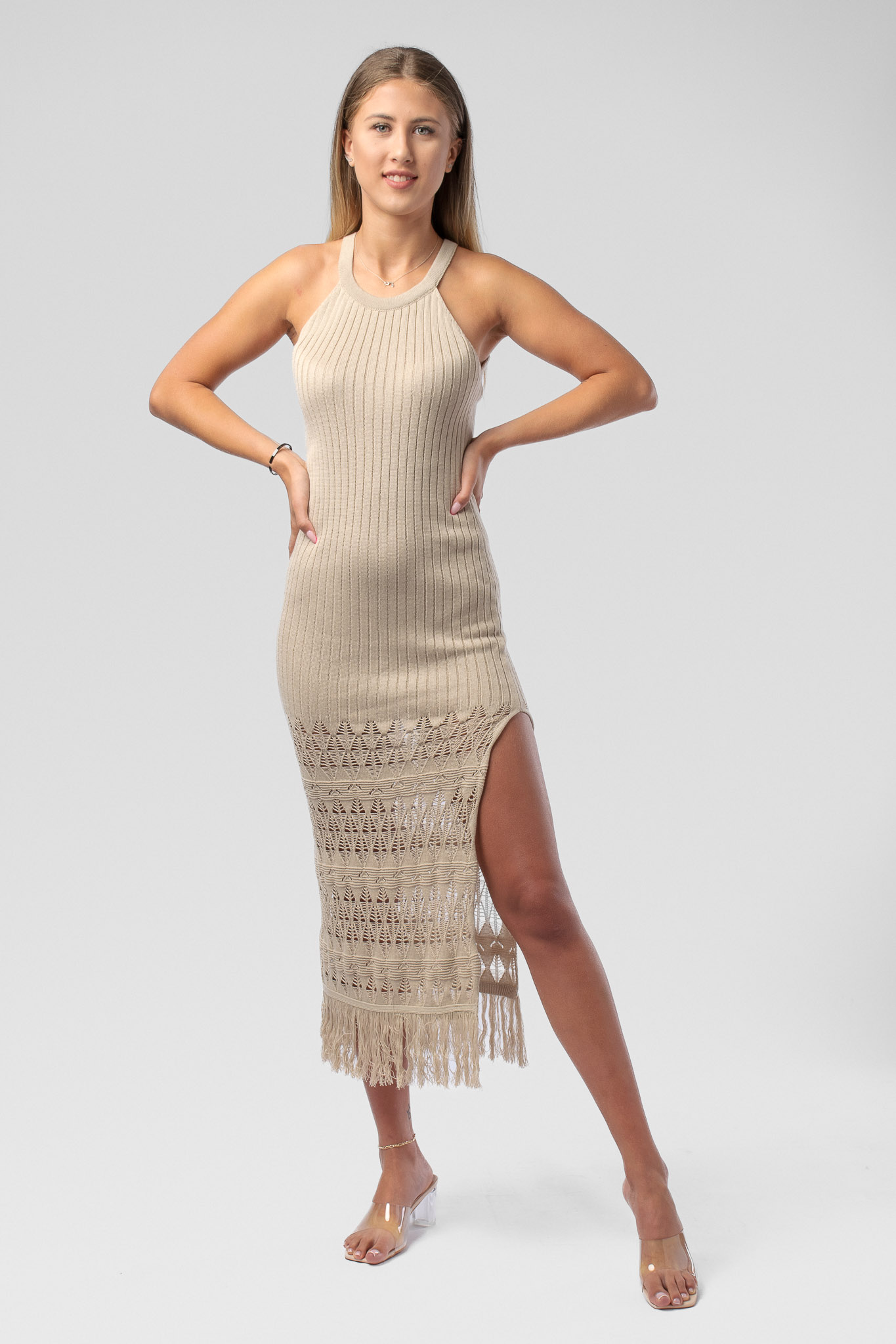 Trendové letné dámske šaty v béžovej farbe. Háčkované šaty ukončené strapcami, s pekným vzorom na sukni, s rázporkom. Šaty sú ideálne nielen na dovolenku, ale aj na bežné nosenie.