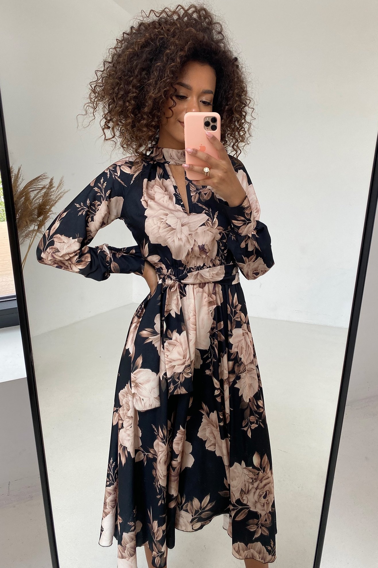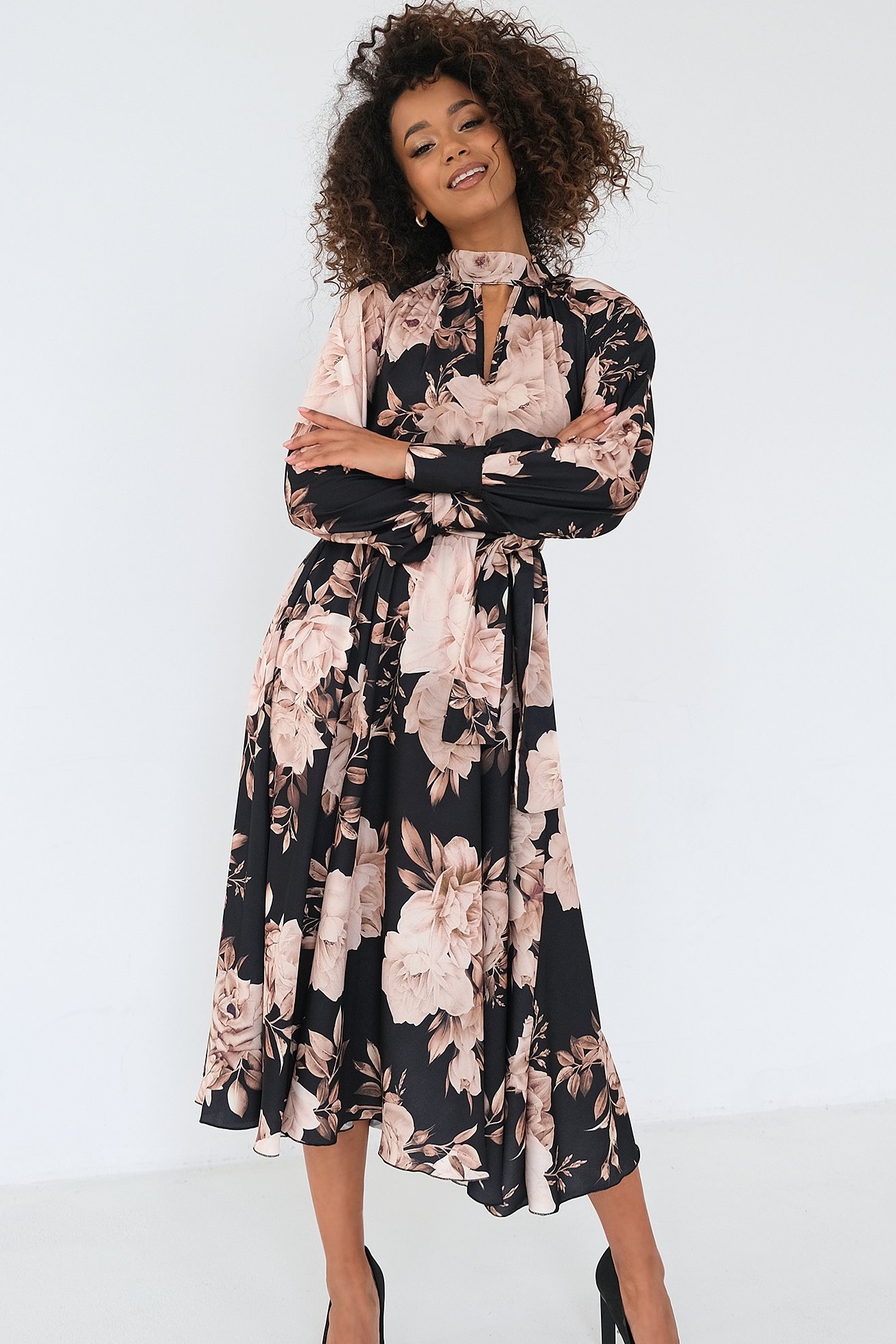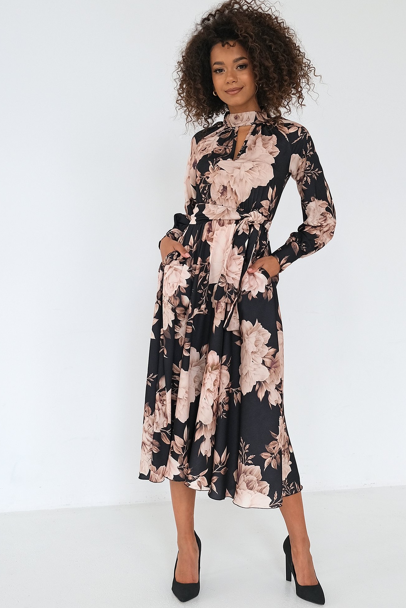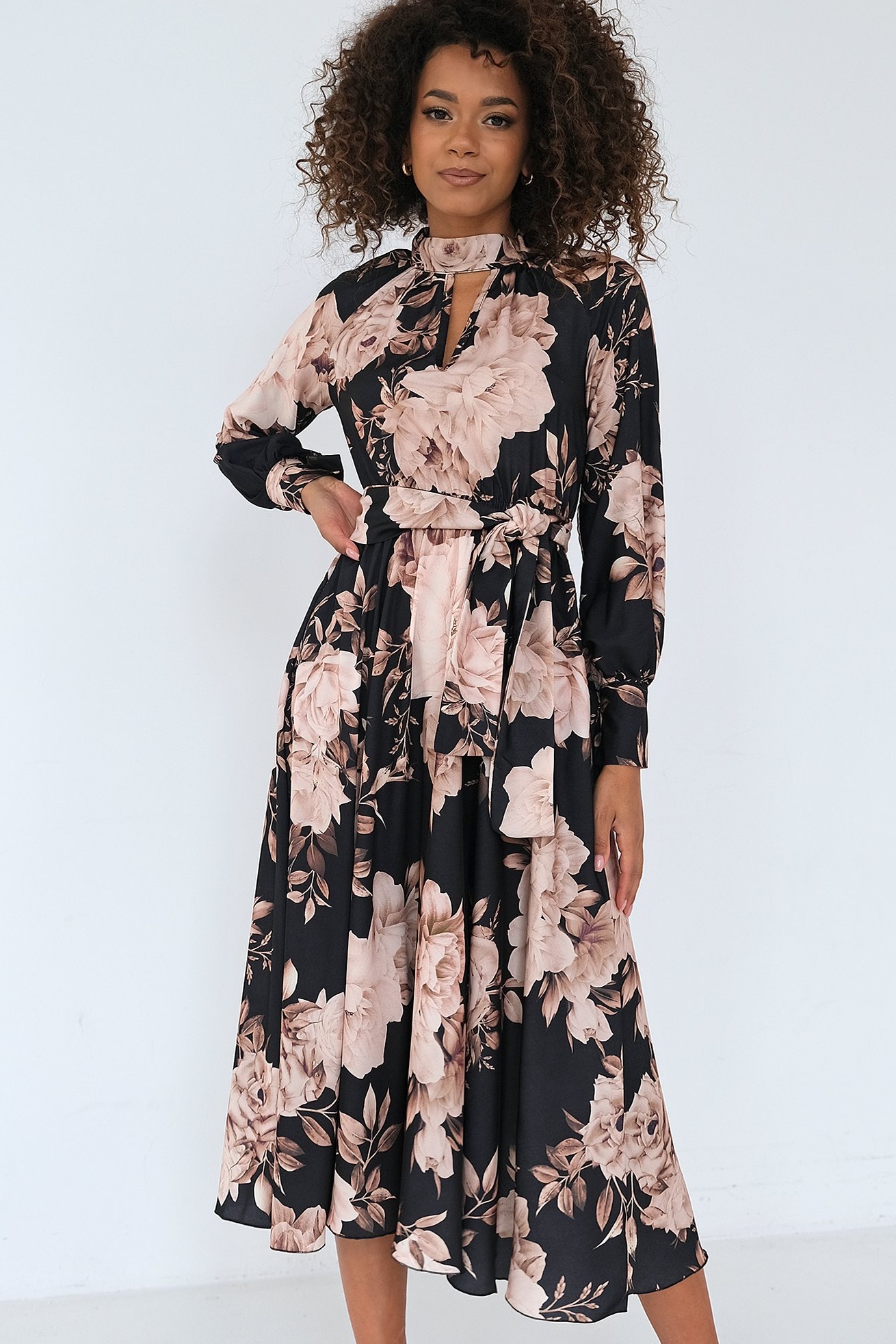 Elegantné dámske midi šaty v čiernej farbe ozvláštnené béžovým kvetovaným vzorom. Šaty sú veľmi ženské, vhodné na príležitosť ja do práce. Šaty majú dlhý rukáv, po bokoch malé vrecká a elastickú gumu v páse. Okolo krku sú ozvláštnené zapínaním.