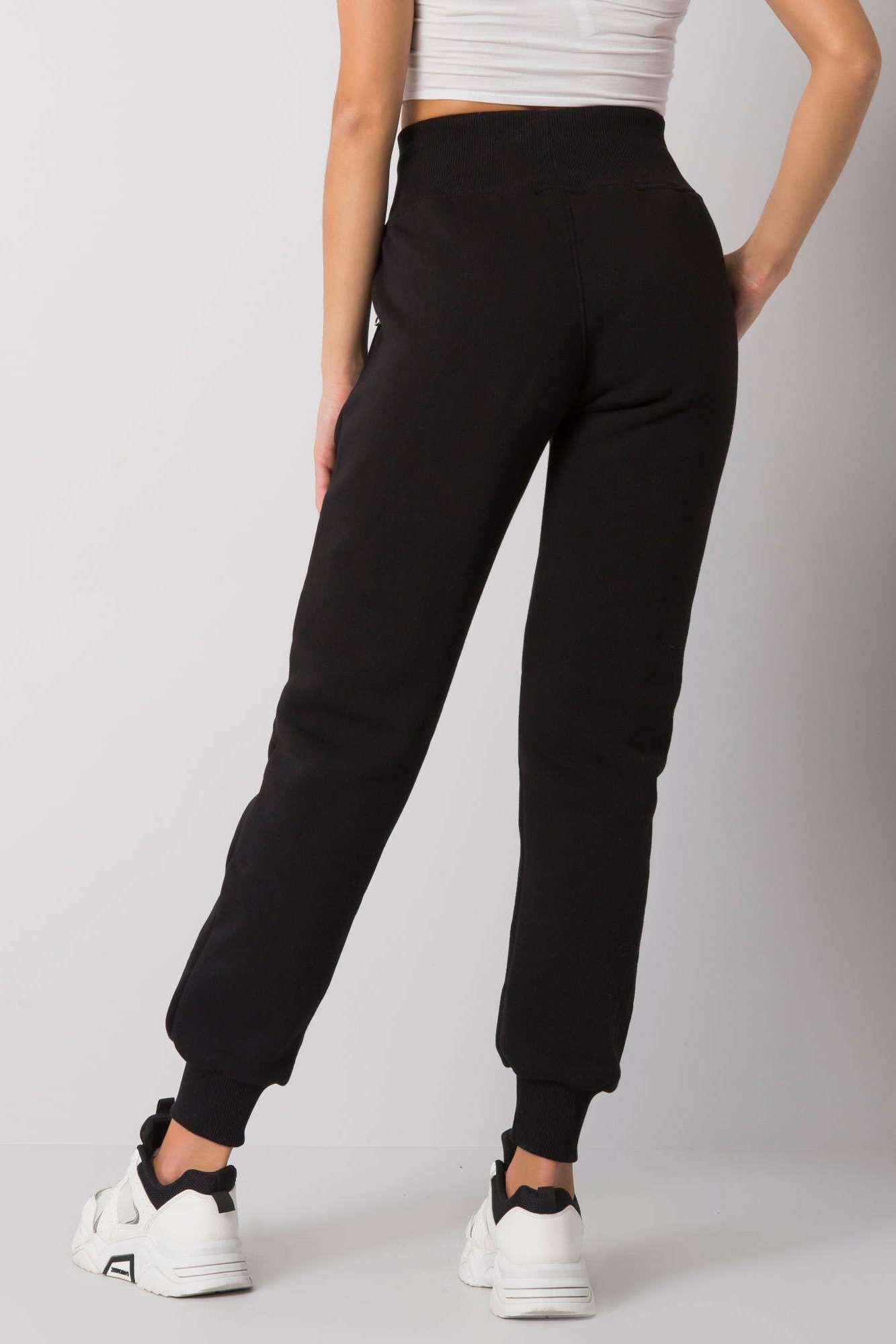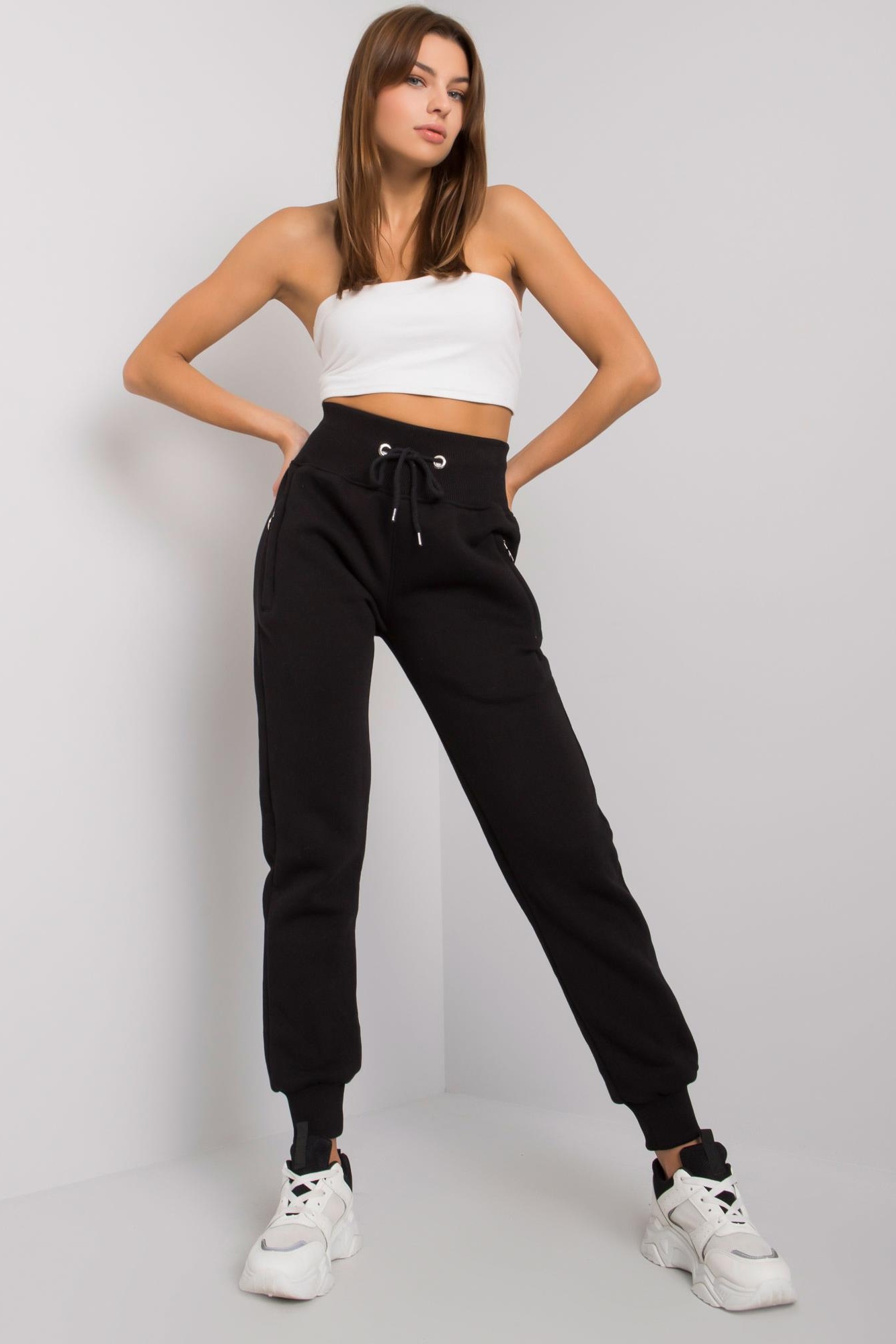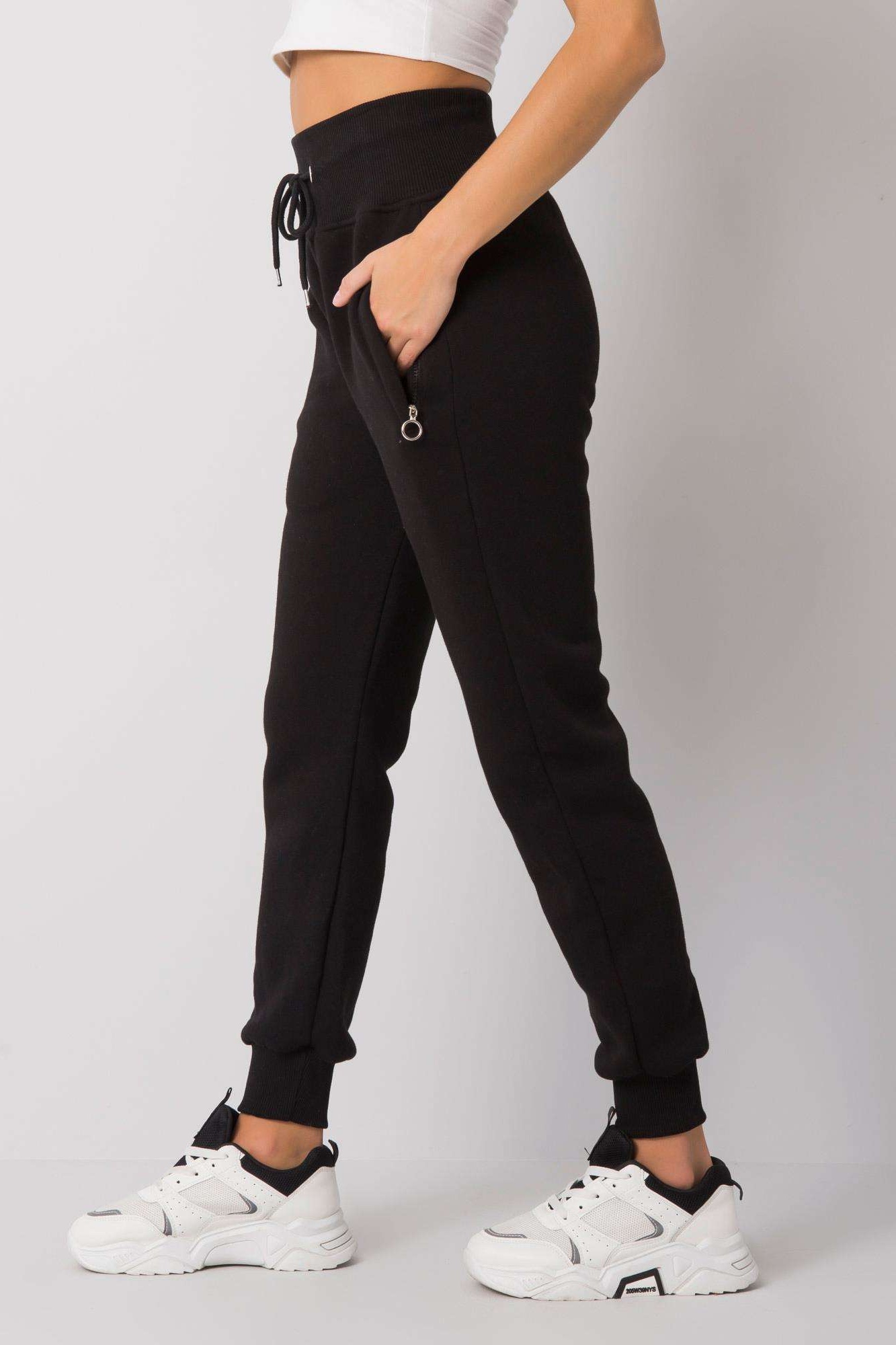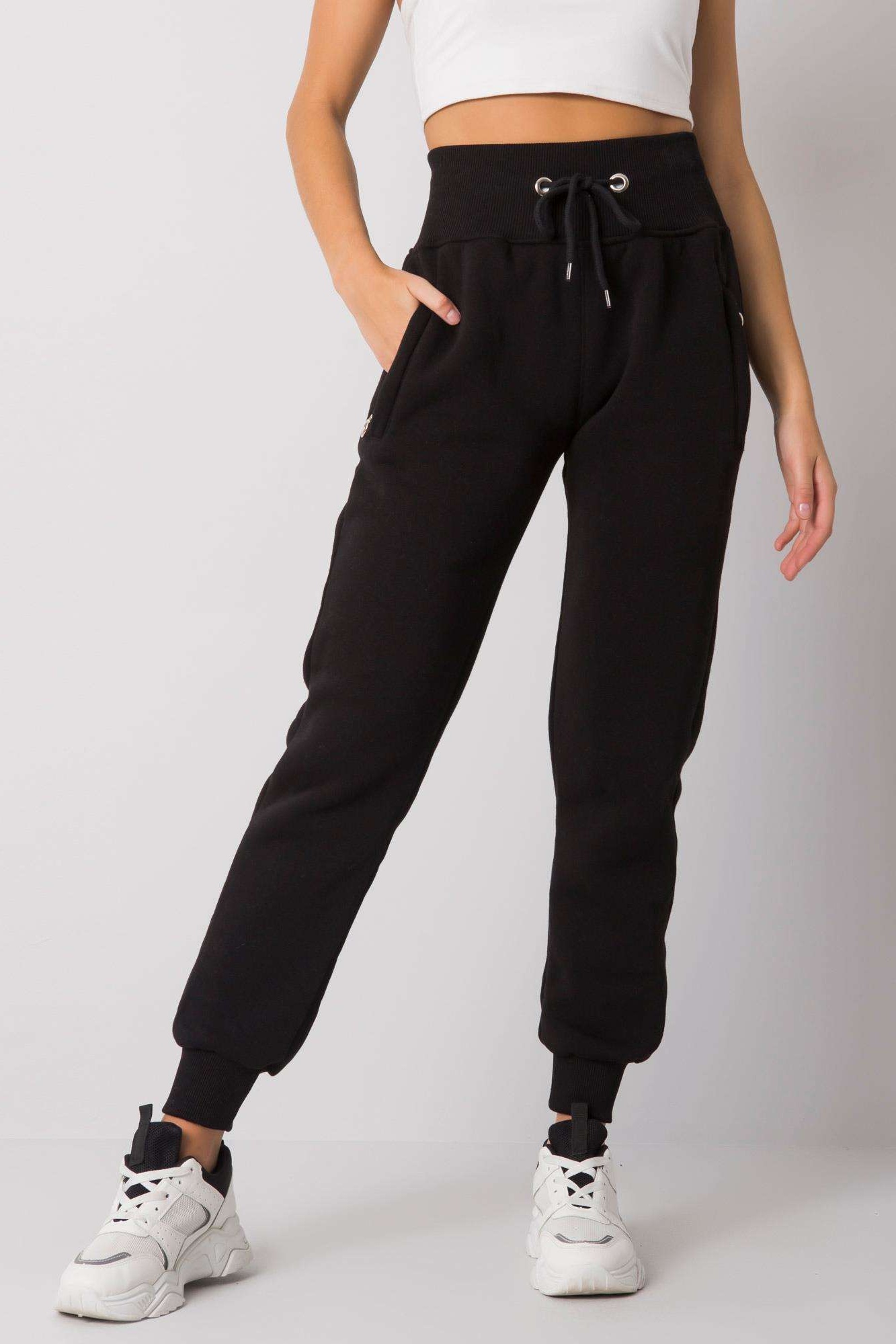 Pohodlné a trendy dámske tepláky v univerzálnej čiernej farbe. Tepláky majú vysoký pás so sťahovacou šnúrkou. Tepláky majú vrecká, sú vhodné na voľný čas.