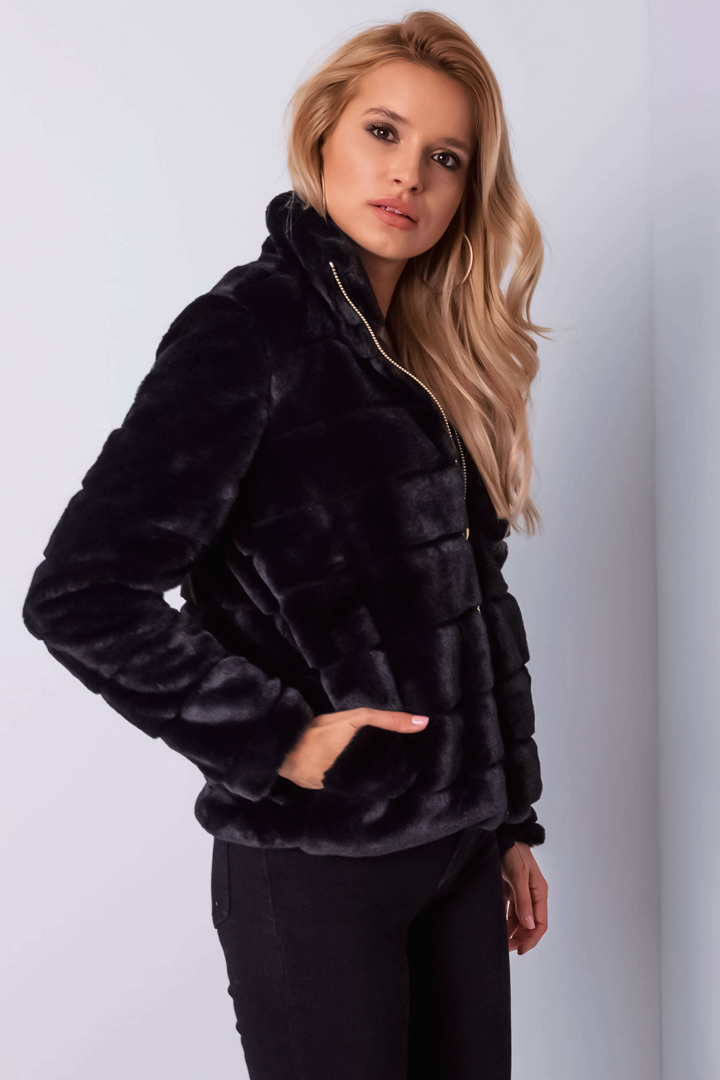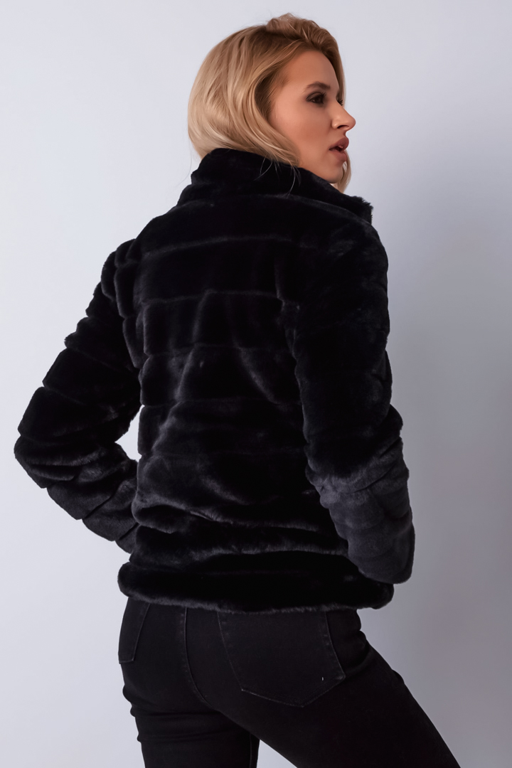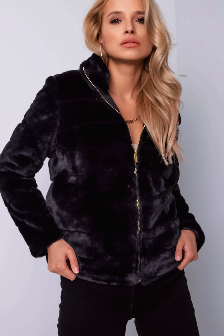Dámsky kožuštek Kirah v čiernej farbe. Kožušinová bunda so zapínaním na zips, s dlhým rukávom, praktickými vreckami po bokoch. Príjemný a teplý kožúšok vhodný k šatám aj džínsom, ideálny na chladné dni.