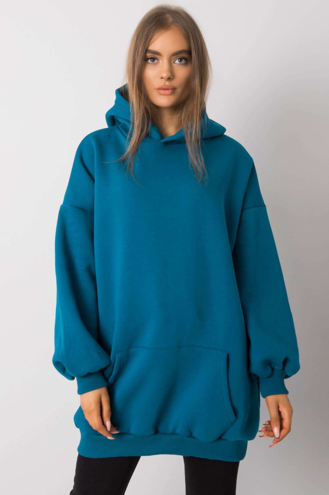 Trendová dámska mikina v morskej modrej farbe. Mikina v oversize strihu s dlhým rukávom, doplnená kapucňou a veľkým vreckom na prednej strane.