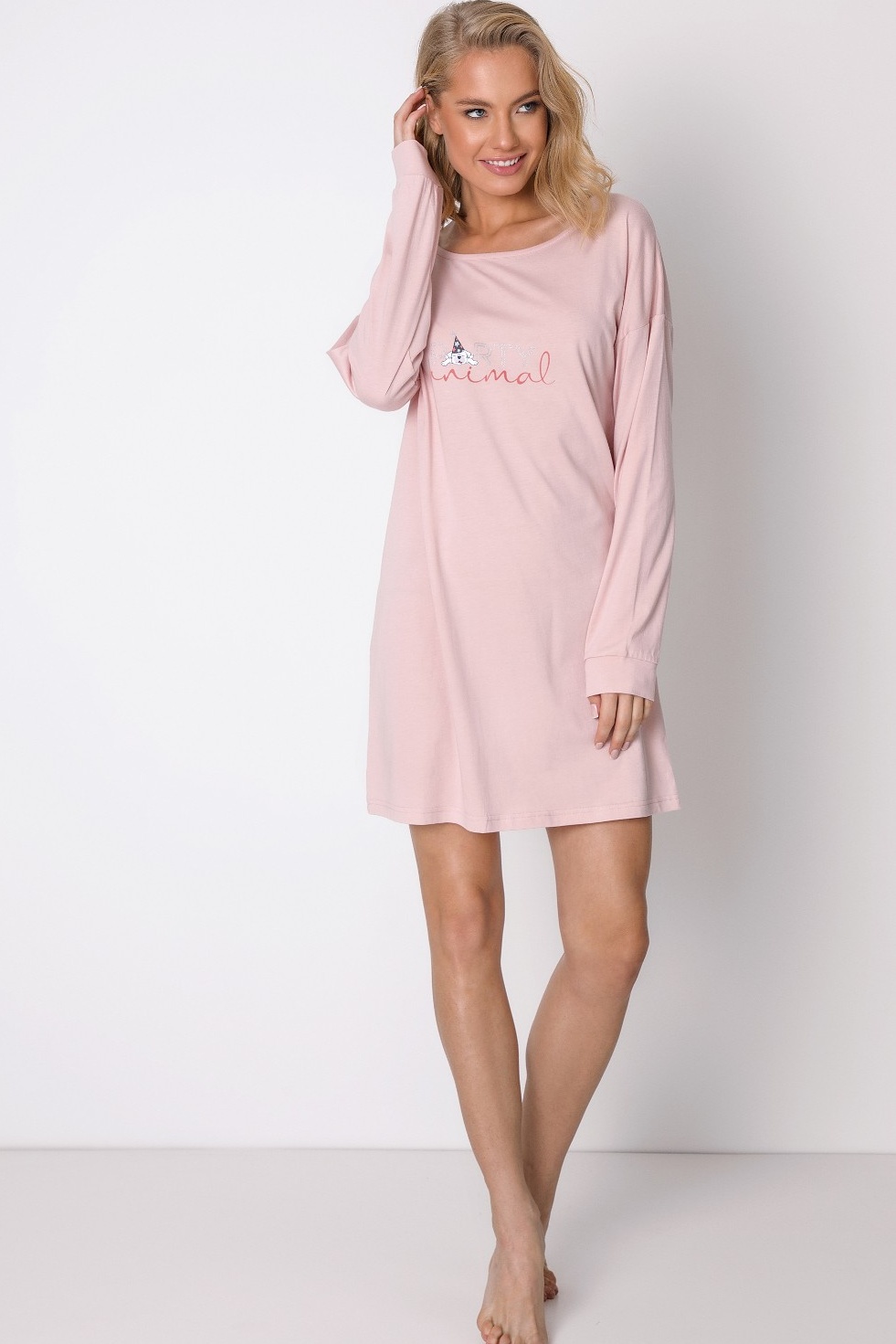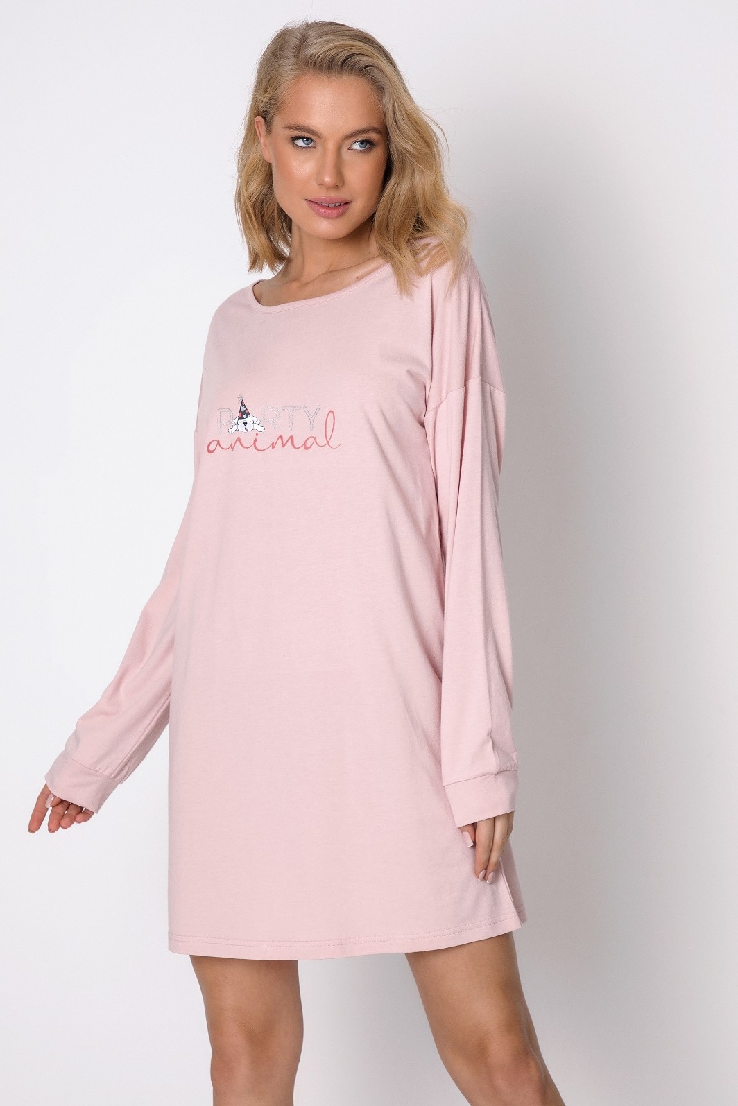 Pohodlná dámska nočná košeľa v púdrovej farbe s dlhým rukávom. Košeľa je doplnená nápisom, dĺžka nad kolená.