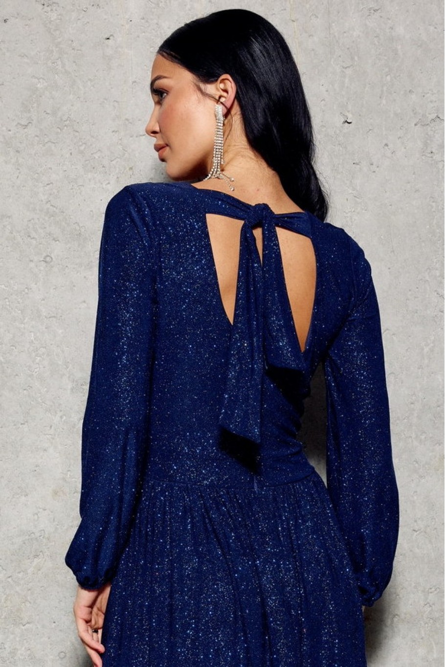 Luxusné dámske brokátové šaty v tmavomodrej farbe. Spoločenské maxišaty s dlhým voľným rukávom ukončeným gumičkou. Šaty s viazaním na chrbáte, s prekladaným výstrihom, ozvláštnené vysokým a pútavým rázporkom. Tieto večerné šaty sú vhodné na akúkoľvek výnimoťnú spoločenskú udalosť ako je ples, firemný večierok, svadba aj stužková.