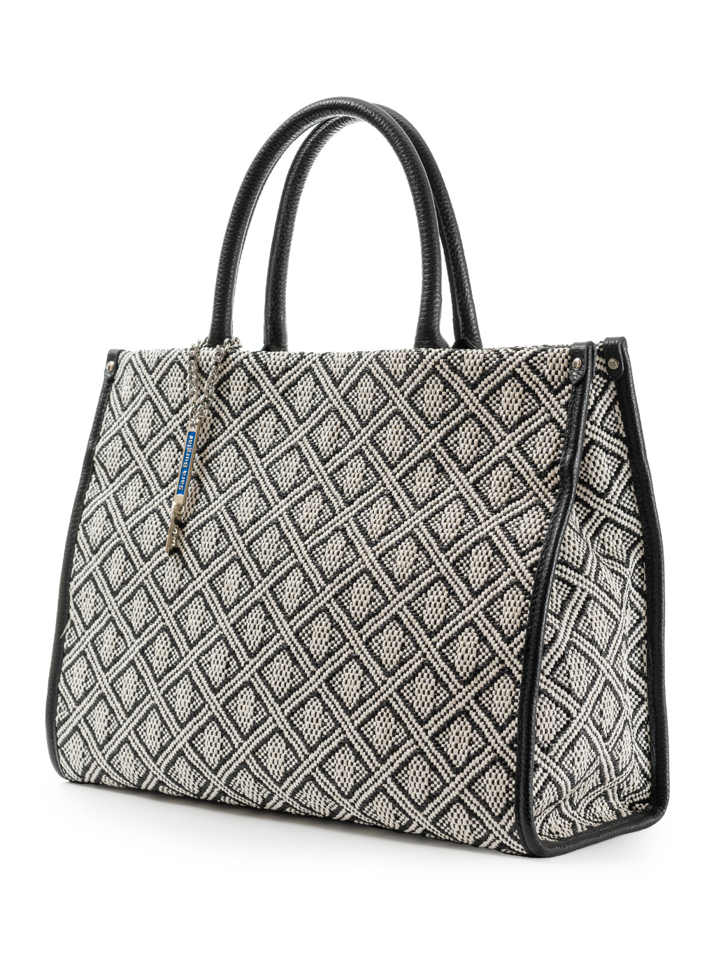 Sara Burglar Rombi - dámska kabelka Materiál 1: 100% bavlna Materiál 2: 100% koža Farba: čierna, biela Rozmery: výška: 28 cm • hĺbka: 15,5 cm • šírka: 37,5 cm Zapínanie: mechanické Ramienko na plece: áno Počet komôr: 3 Ochranné nožičky: nie Spôsob nosenia: cez plece, do ruky Detail: logo značky Model: ROMBI2314 Made in Italy