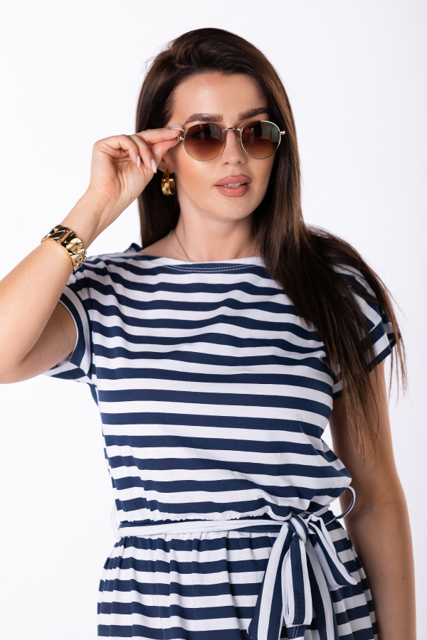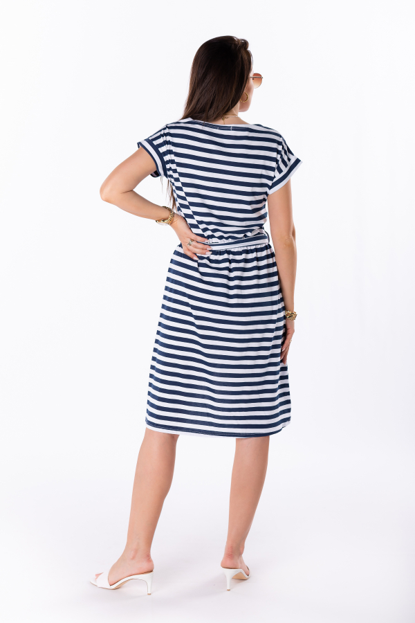 Ležérne dámske šaty z kvalitnej bavlny doplnené pruhovaným vzorom. Šaty v kombinácii bielej a tmavomodrej, majú elastický pás doplnený opaskom vo farbe šiat. Šaty majú asymetrický strih, v prednej časti sú kratšie, vzadu dlhšie. Šaty nemajú podšívku.
