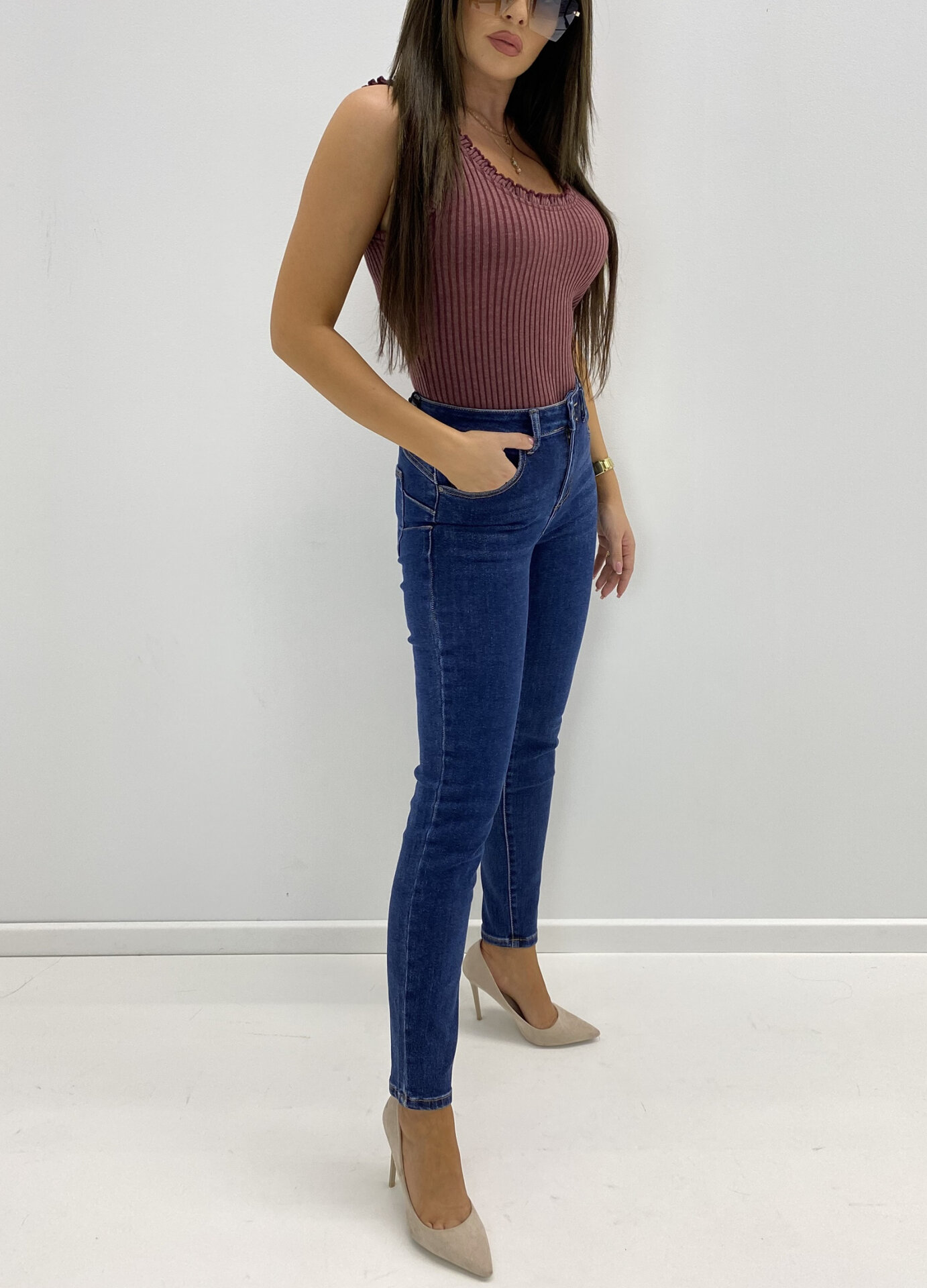 Dámske rifle klasického rovného strihu v tmavomodrej farbe. Rifle so zapínaním na gombík aj zips, s vreckami.