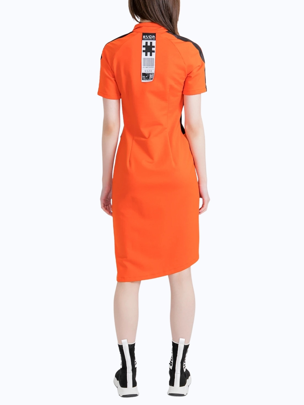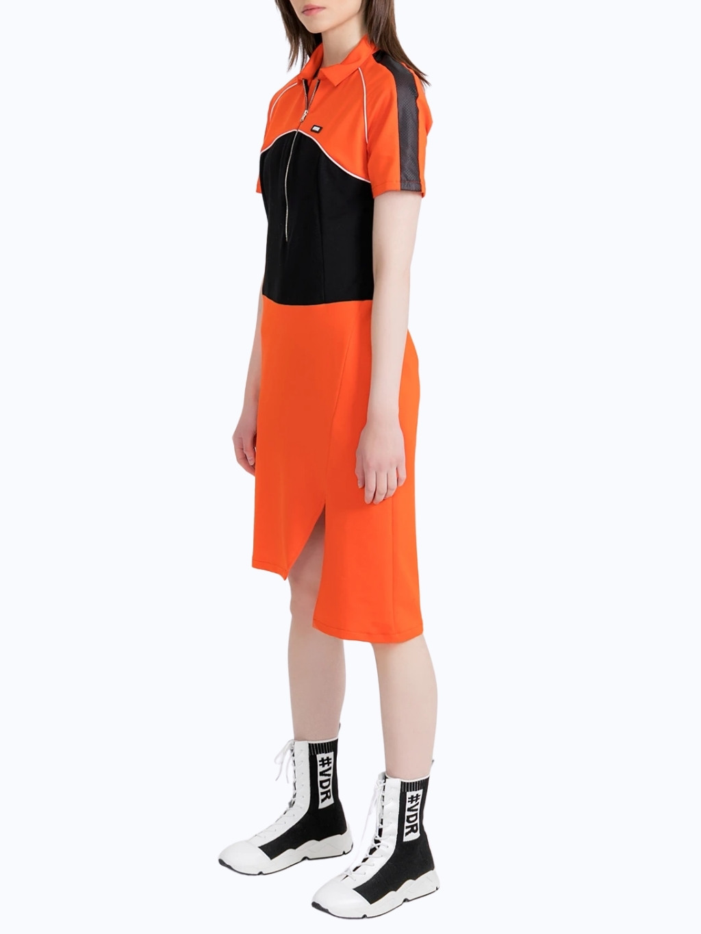 #VDR Orange - dámske šaty Materiál: 60% bavlna, 37% polyester, 3% elastan Farba: oranžová, čierna Strih: áčkovy  Štýl: športový Vzor: so vzorom Rukávy: krátke rukávy Zapínanie: na zips Príležitosť: voľný čas Dĺžka: midi Model: VW9277