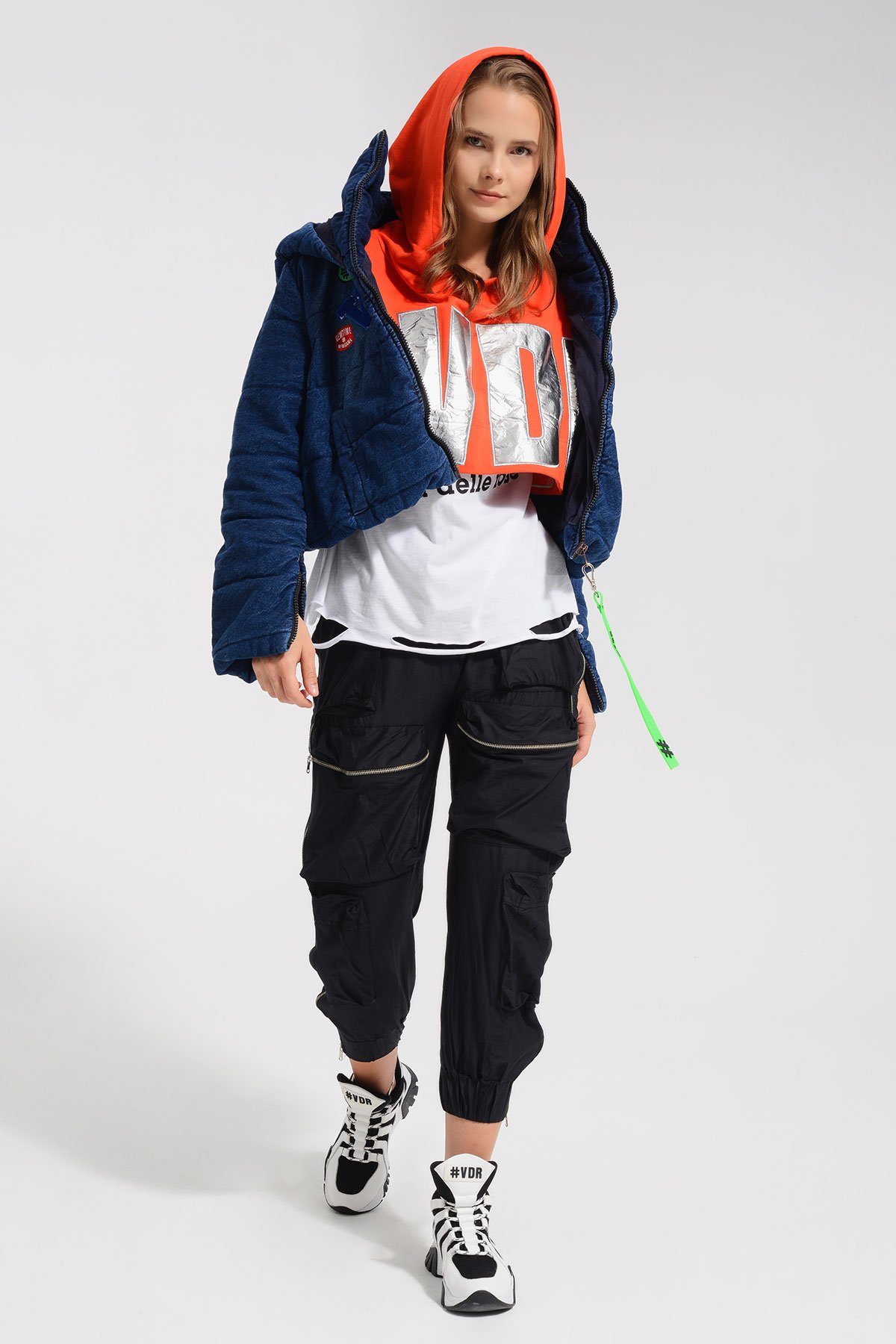 #VDR Denim Blu - dámska bombera Materiál: 100% bavlna Typ: s kapucňou Vzor: so vzorom Dĺžka: krátka Zapínanie: na zips Farba: tmavomodrá Model: VW21-8388 Made In Turkey