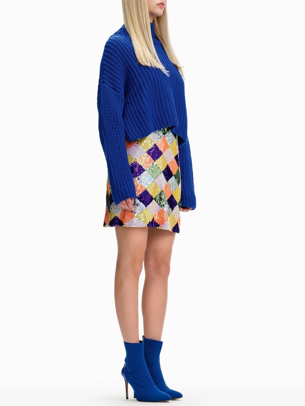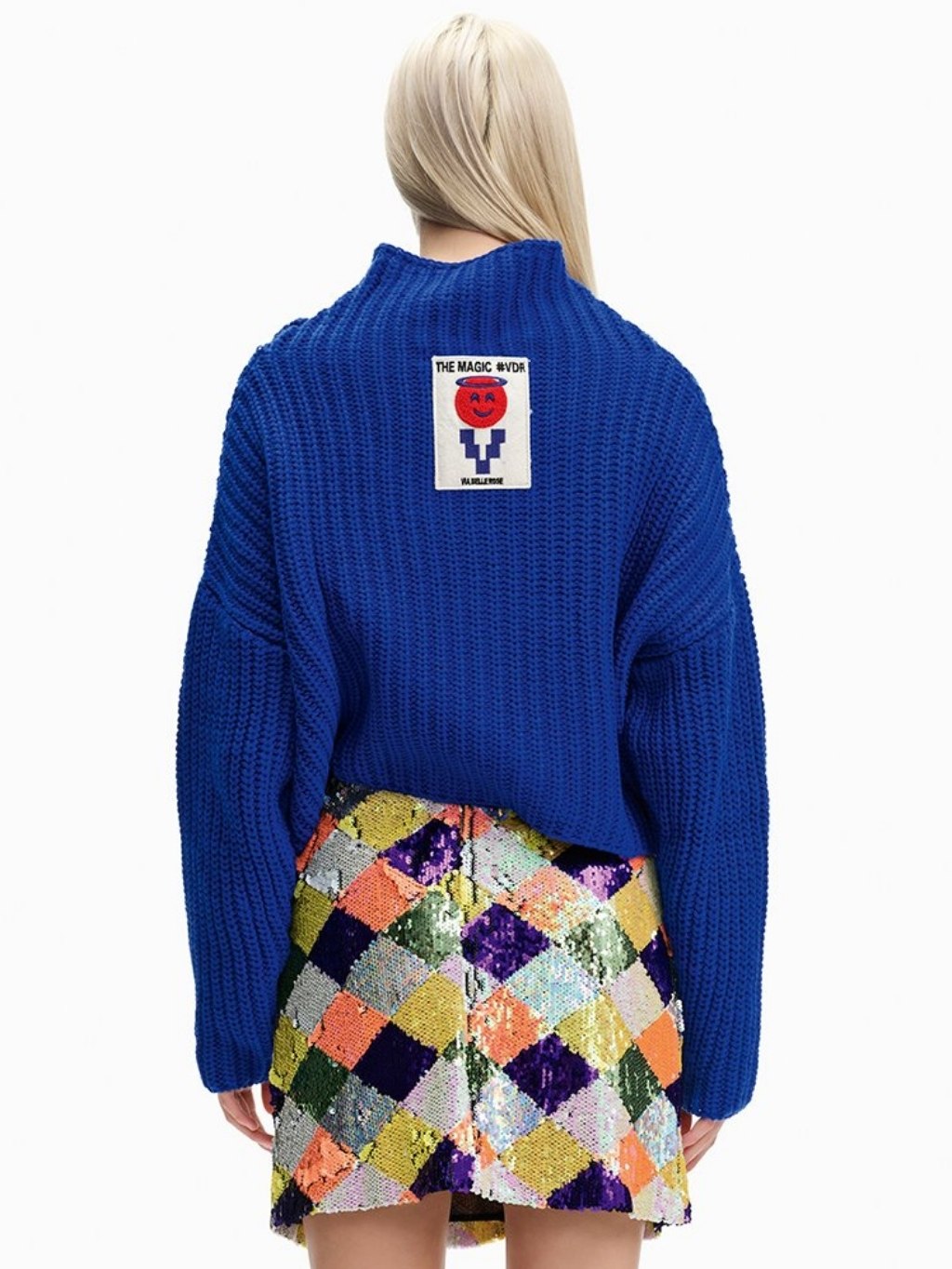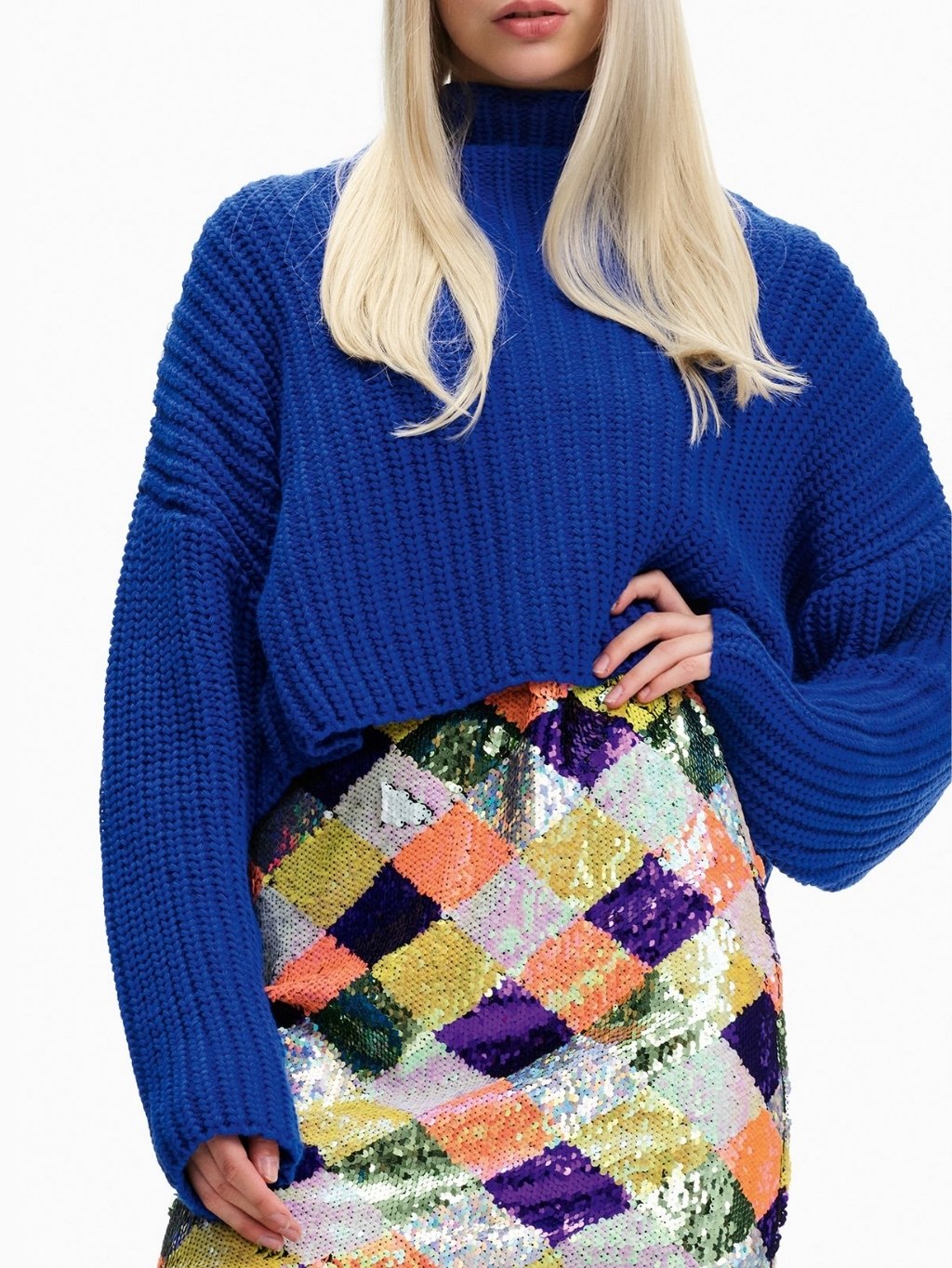 #VDR Mavi - dámsky sveter Materiál: 100% akryl Farba: modrá Strih: oversize Vzor: jednofarebný Zapínanie: bez zapínania Výstrih: rolák Model: 10012
