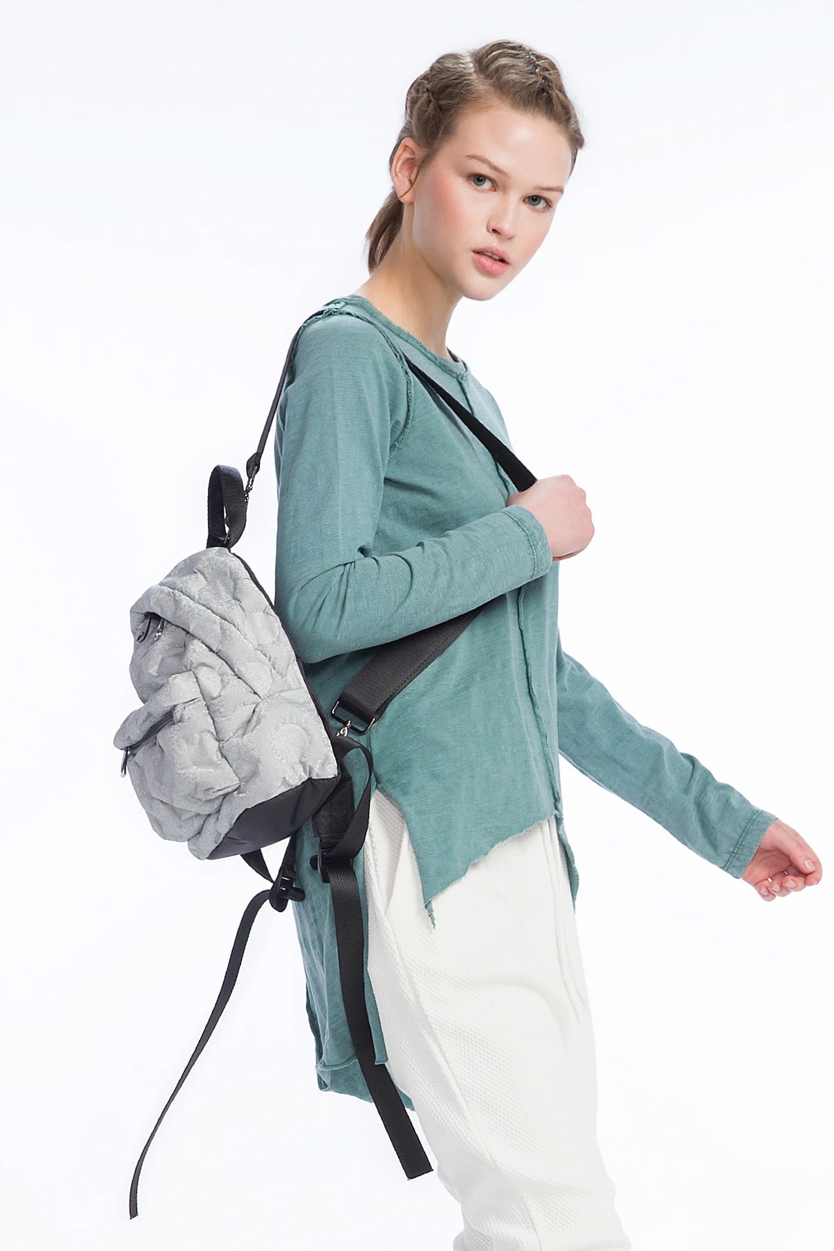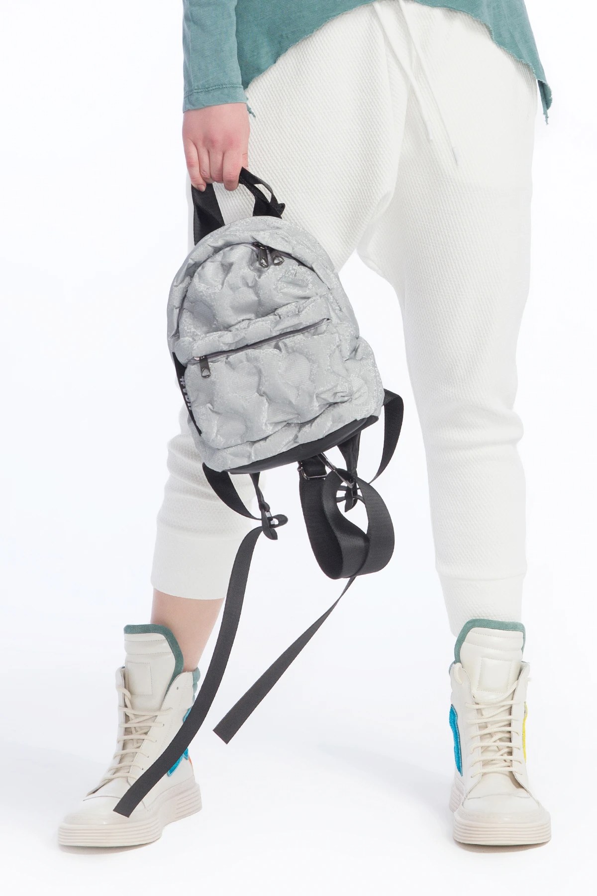 #VDR New Grigio - batoh Materiál: 50% bavlna, 50% impertex Farba: strieborná Rozmery: výška: 20 cm • hĺbka: 8 cm • šírka: 20 cm Zapínanie: na zips Ramienko na plece: áno Počet komôr: 3 Spôsob nosenia: do ruky, cez plecia Detail: doplnky čiernej farby Model: Pois
